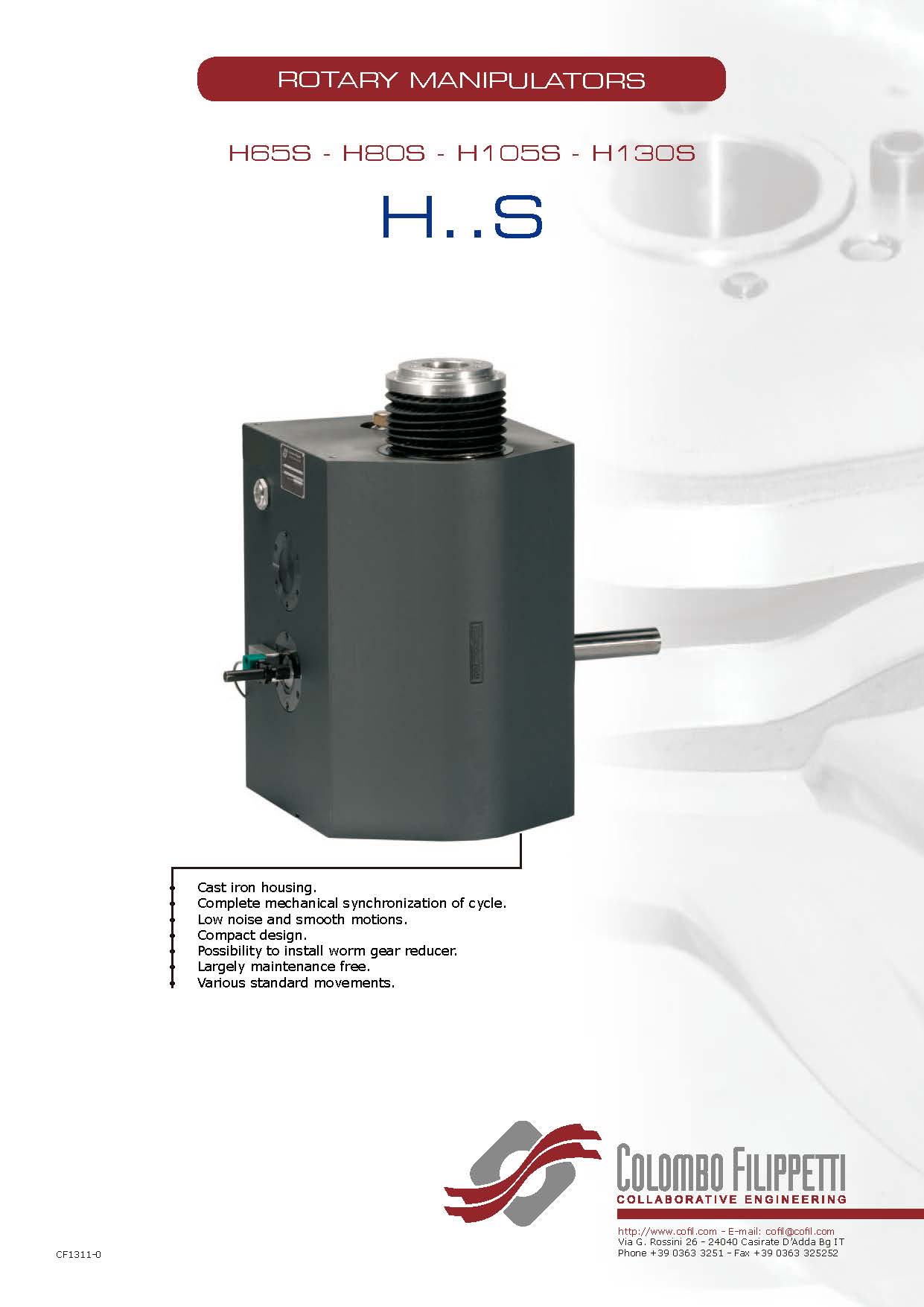 COLOMBO FILIPPETTI spa的H..S系列旋轉(zhuǎn)機(jī)械手是共軛雙凸輪機(jī)構(gòu),將輸入的勻速旋轉(zhuǎn)運(yùn)動(dòng)轉(zhuǎn)換為旋轉(zhuǎn)取放的典型運(yùn)動(dòng),即旋轉(zhuǎn)間歇運(yùn)動(dòng)和線性交替運(yùn)動(dòng)。