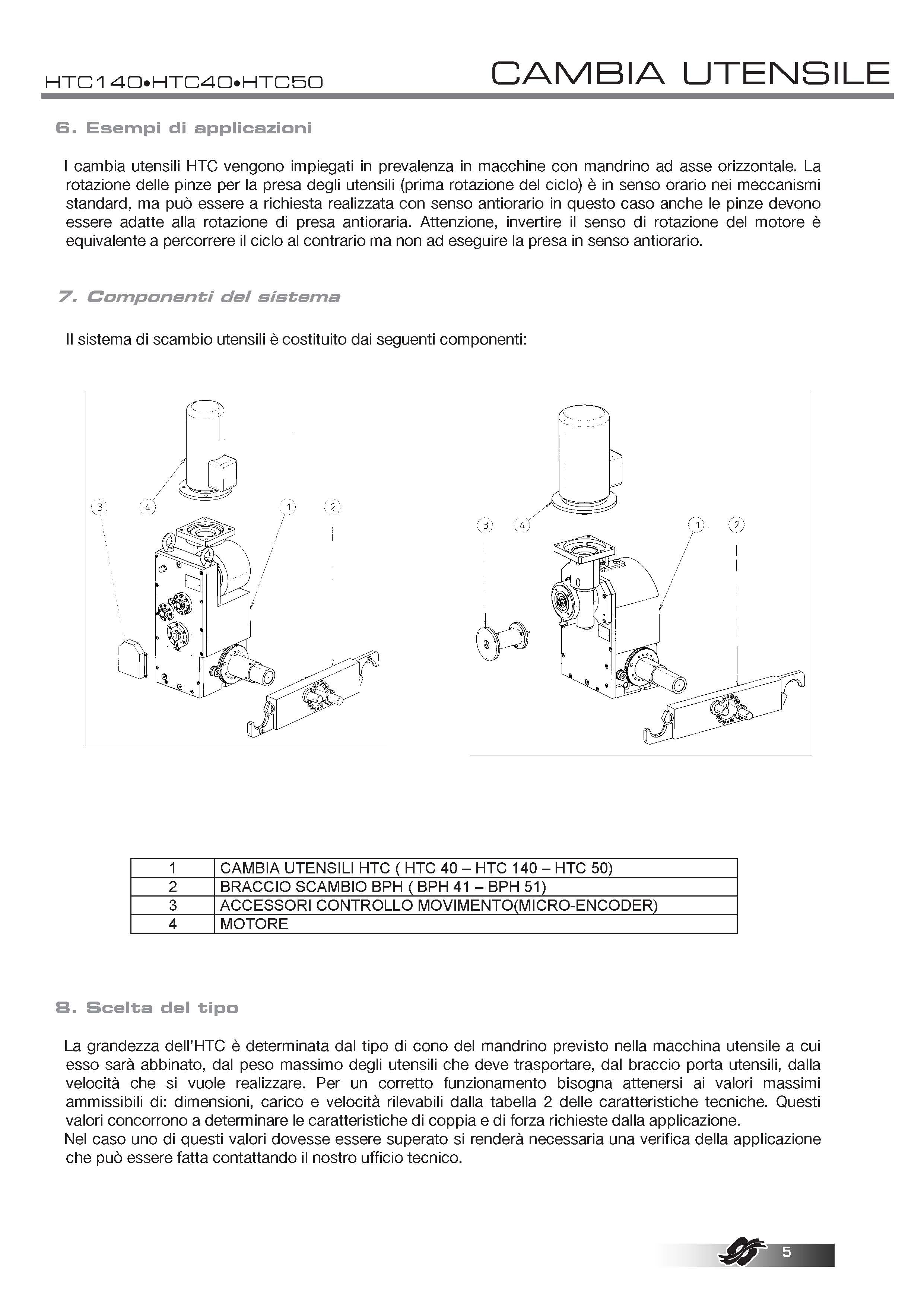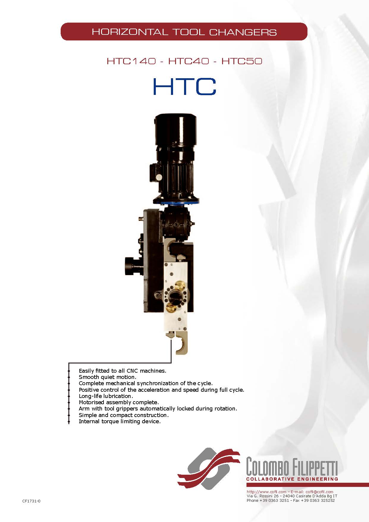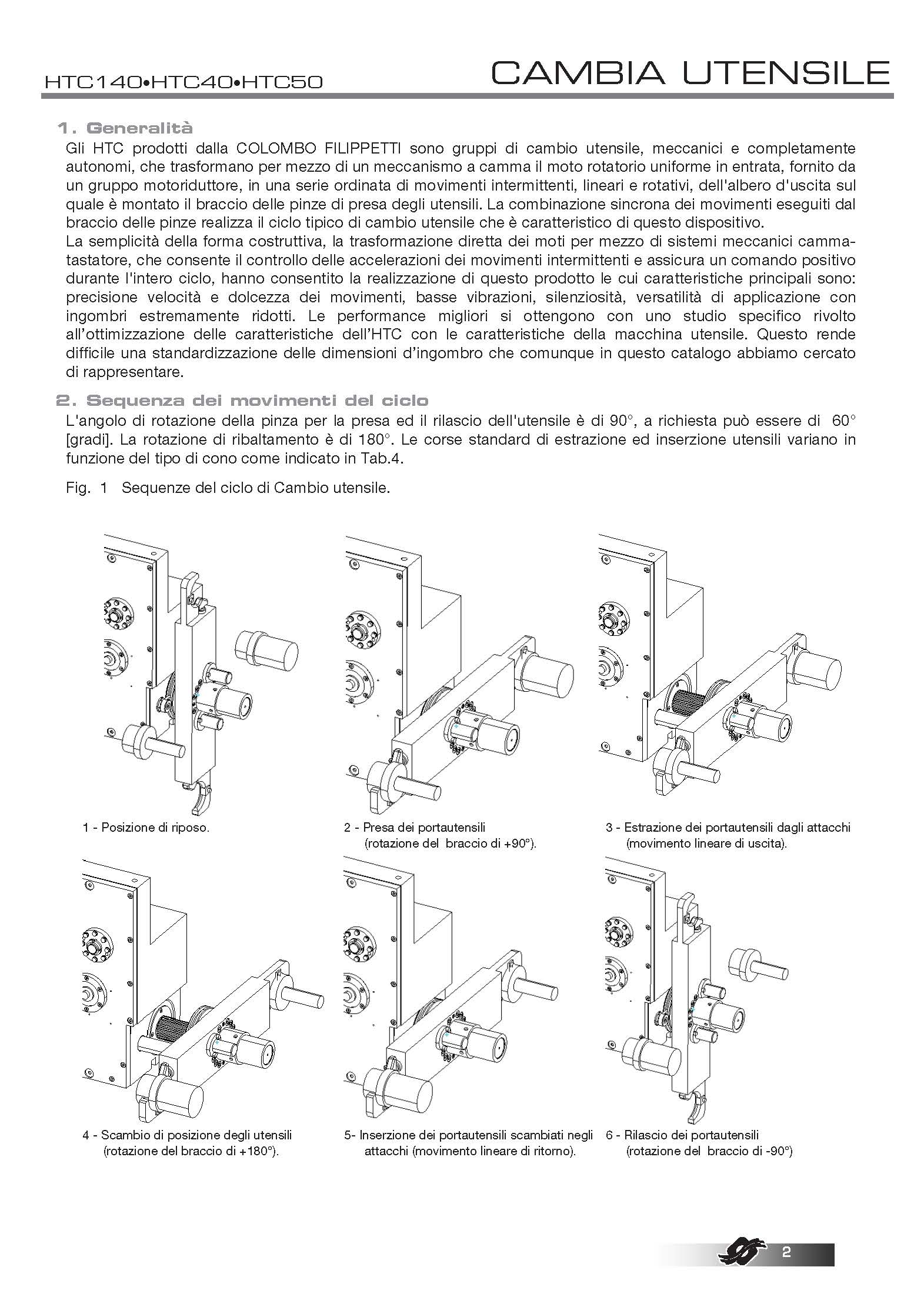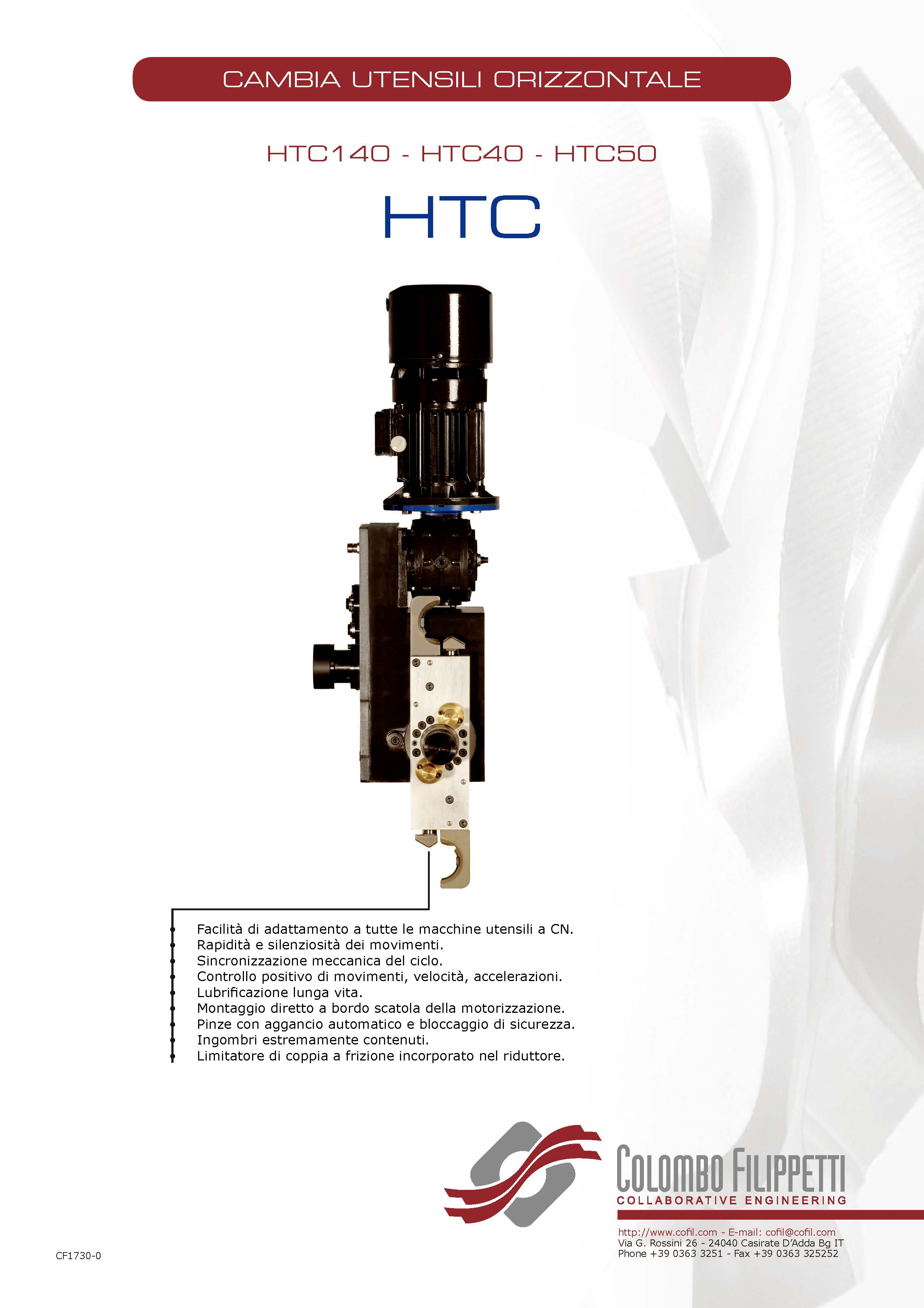 COLOMBO FILIPPETTI spa 的 HTC(臥式換刀裝置)是機械式且完全自主的換刀裝置,它通過凸輪機構將齒輪電機裝置提供的均勻傳入旋轉運動轉換為一系列有序的間歇線性輸出軸的旋轉運動,工具夾具的臂鍵鎖在輸出軸上。
